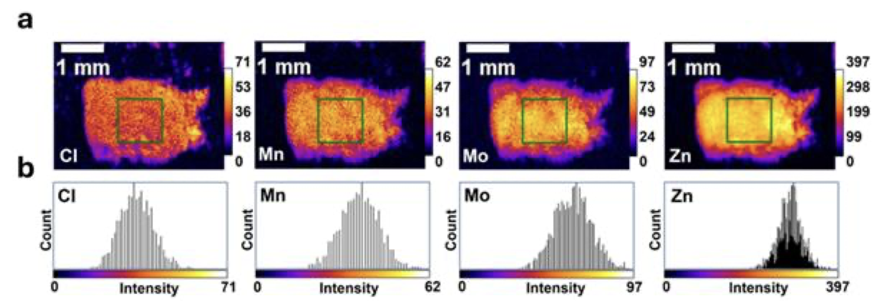To assess the elemental distribution of Mn, Zn, Cl, and Mo in the bulk material, the researchers employed 2D micro X-ray fluorescence spectroscopy (2D-microXRF; resolution approximately 25 micrometers) on a small piece of compound 1 (Fig. 6). Homogeneous distribution of all four elements is evident from similar intensities across the bulk material, particularly within the selected (1 x 1) mm2 area indicated by the green square (Fig. 6a). This becomes more apparent when examining the intensity histograms generated for this area (Fig. 6b), which display a normal distribution of intensities without extreme values.