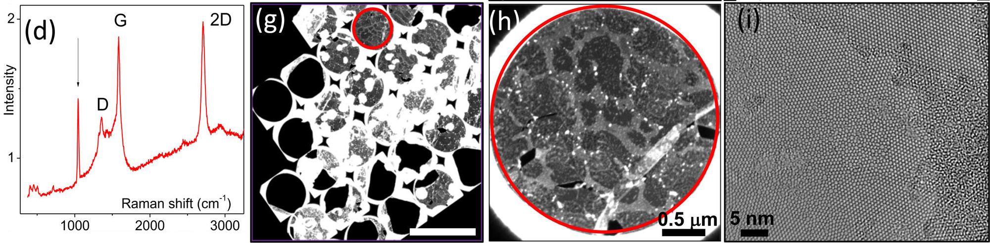 For their investigation, they assigned the Raman spectra to regions of 2D silica by correlated HR-TEM measurements using freestanding graphene over a TEM grid as sample support (Fig. 2). The atomic structure visible in the HR-TEM image confirms that the deposited layer on graphene indeed contains 2D-SiO2 (Fig. 2i).