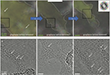 Next, in Figure 2, the authors present a sequence of images recorded during the first-cycle lithiation process (bilayer system) and a subsequent delithiation process (trilayer system). The Li crystals grow with faceted shapes during lithiation (Figure 2a), while during delithiation they do not simply shrink in shape but transform into unfaceted irregular structures (Figure 2b). Before the lithiation starts (Figure 2a), the pristine graphene is rather free of contamination. The inserted Fourier transform pattern confirms the presence of graphene (lattice constant of a = 2.46 Å). Already after 5 seconds of cycling, many Li nucleation seeds are formed and identified by their dark contrast (one dark patch is marked by the white arrow), with their density estimated as approximately 0.02 nm−2. As lithiation progresses further, the Li seeds grow into larger ultrathin crystalline plates with faceted shapes (most of them have a triangular shape) and merge with each other. The arrows in Figure 2a mark the same Li crystal at different times of the lithiation. The inset in the image recorded at t = 93 s shows the corresponding Fourier transform where only the second-order reflections of the Li phase [17] can be seen; however, the first-order reflections are missing. In the work presented here, the Li crystals nucleated inside the field of view, so their behavior in the early stages of lithiation, such as nucleation, growth, and coalescence of Li nanocrystals, could be directly observed and therefore better understood. Figure 2b shows an overview of TEM images of a delithiation process in a trilayer-graphene system.