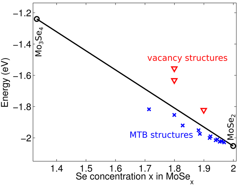 In the new paper, the authors determine the growth mechanism of MTBs. As they have confirmed by DFT calculations, moving to Mo-rich growth conditions significantly lowers the formation energy of MTBs, giving rise to an increased density during growth (Figure 2). Similar to what was previously observed by some authors of [1], however for the case of MoS2[21, 22], vacancy line structures are found to be energetically favorable, as compared to isolated vacancies. Also, Se has a low sticking coefficient,[23] which can result in a local Se-deficit even at excess deposition rates.