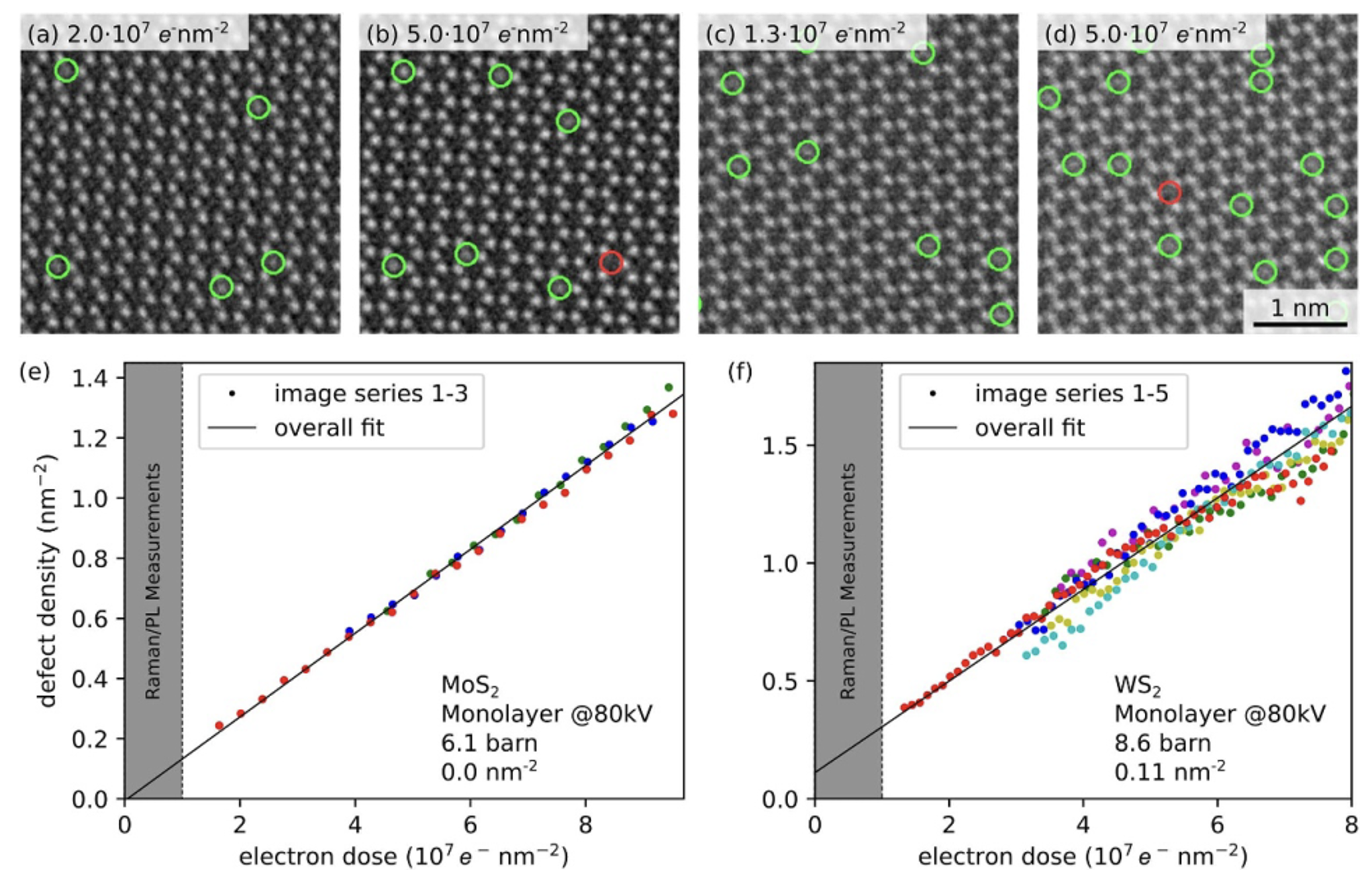 In the first experimental series, the scientists determined defect densities from atomically resolved HRTEM image sequences (Fig. 1). An automated defect detection algorithm, which identifies vacancies based on statistical intensity differences at lattice sites, was applied to each frame in the series. The measured defect density could then be related to the cumulative electron dose delivered to that point. At the electron doses employed, only isolated single or double sulfur vacancies were observed, indicating that the defect generation rate (damage cross-section) remains constant under these conditions. The data in Fig. 1 confirm this linear behavior. By extrapolating to lower doses, the team determined damage cross-sections of 6.1 barns for MoS2 and 8.6 barns for WS2, with intrinsic defect densities of zero for MoS2 and 0.11 nm−2 for WS2.