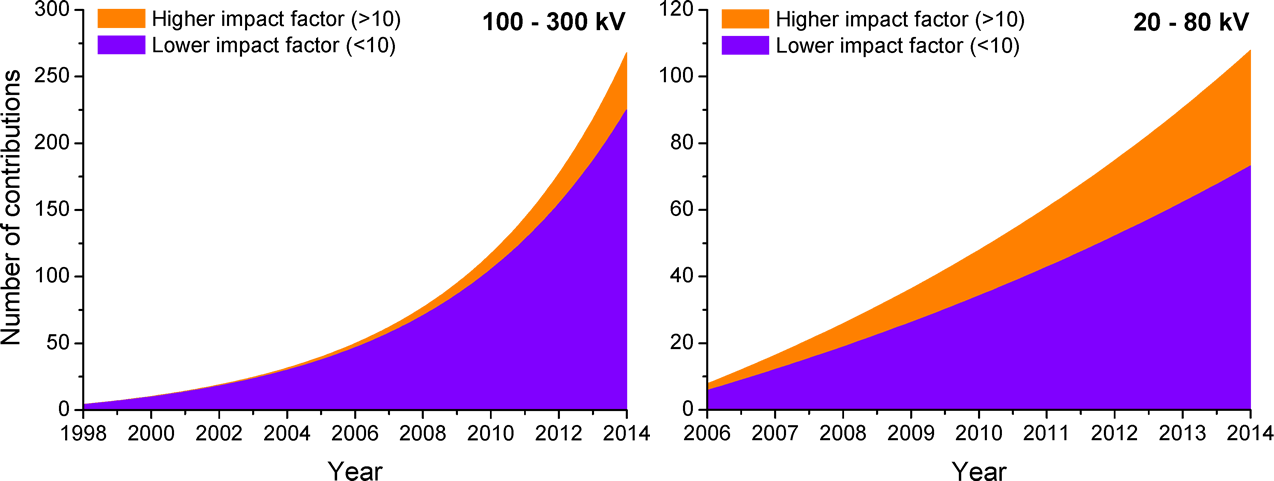 The research on low-voltage high-resolution transmission electron microscopy opens an exciting new era and will be request from tomorrow’s research and industry. This is also reflected in the very high percentage of publications with high impact factor (> 10) in low-voltage HRTEM, which is 30%, and thus higher by a factor of 3 than in medium voltage HRTEM (Fig 2).